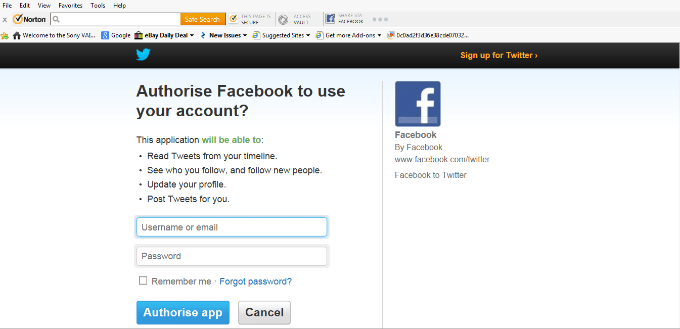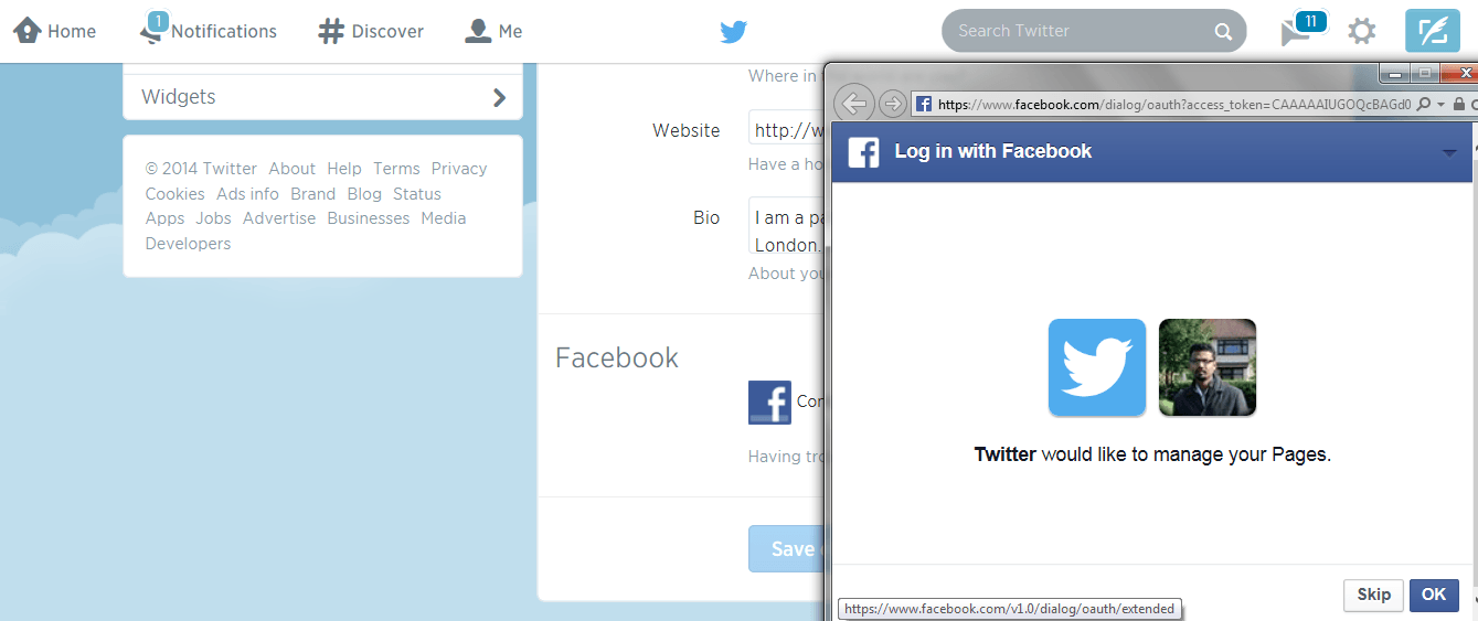 On the next page, you see the option to authorize Facebook to use your Twitter account.