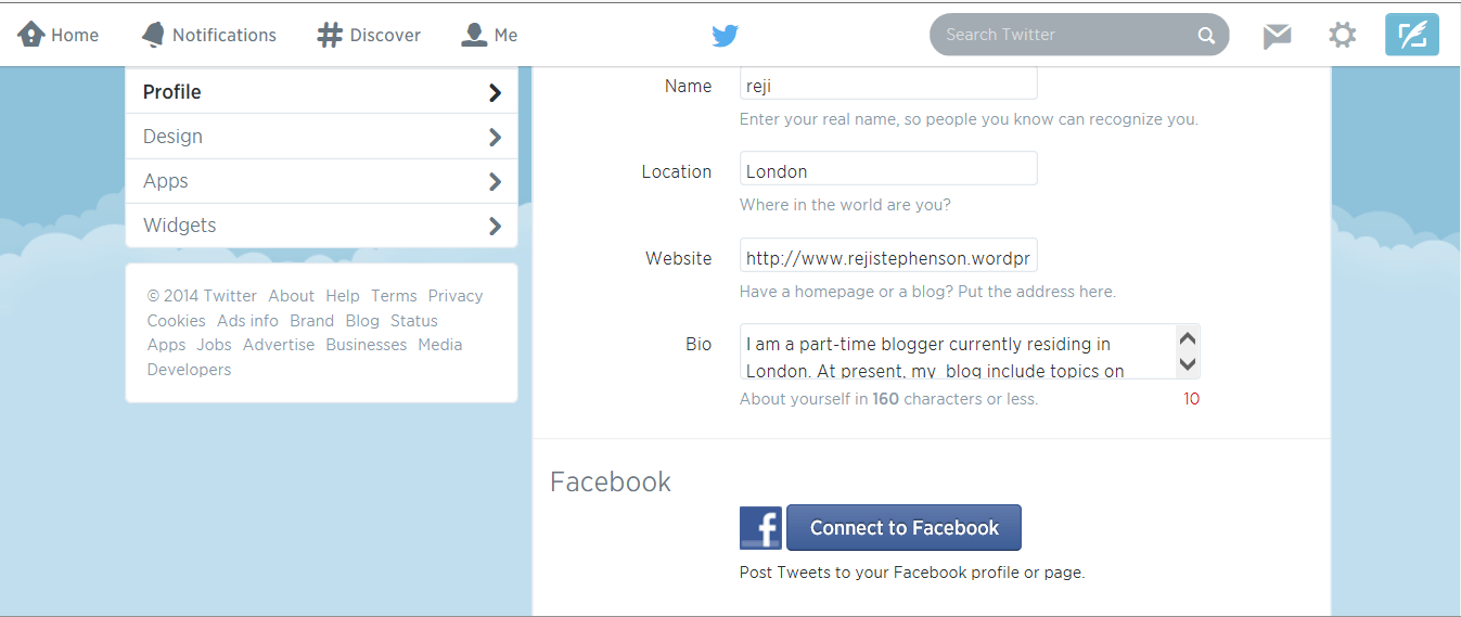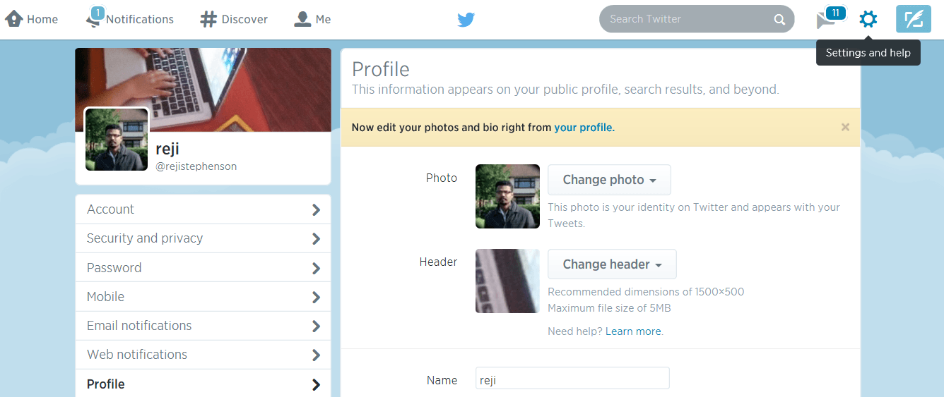 On Twitter, go to settings on the top right hand side and click “Edit Profile.”